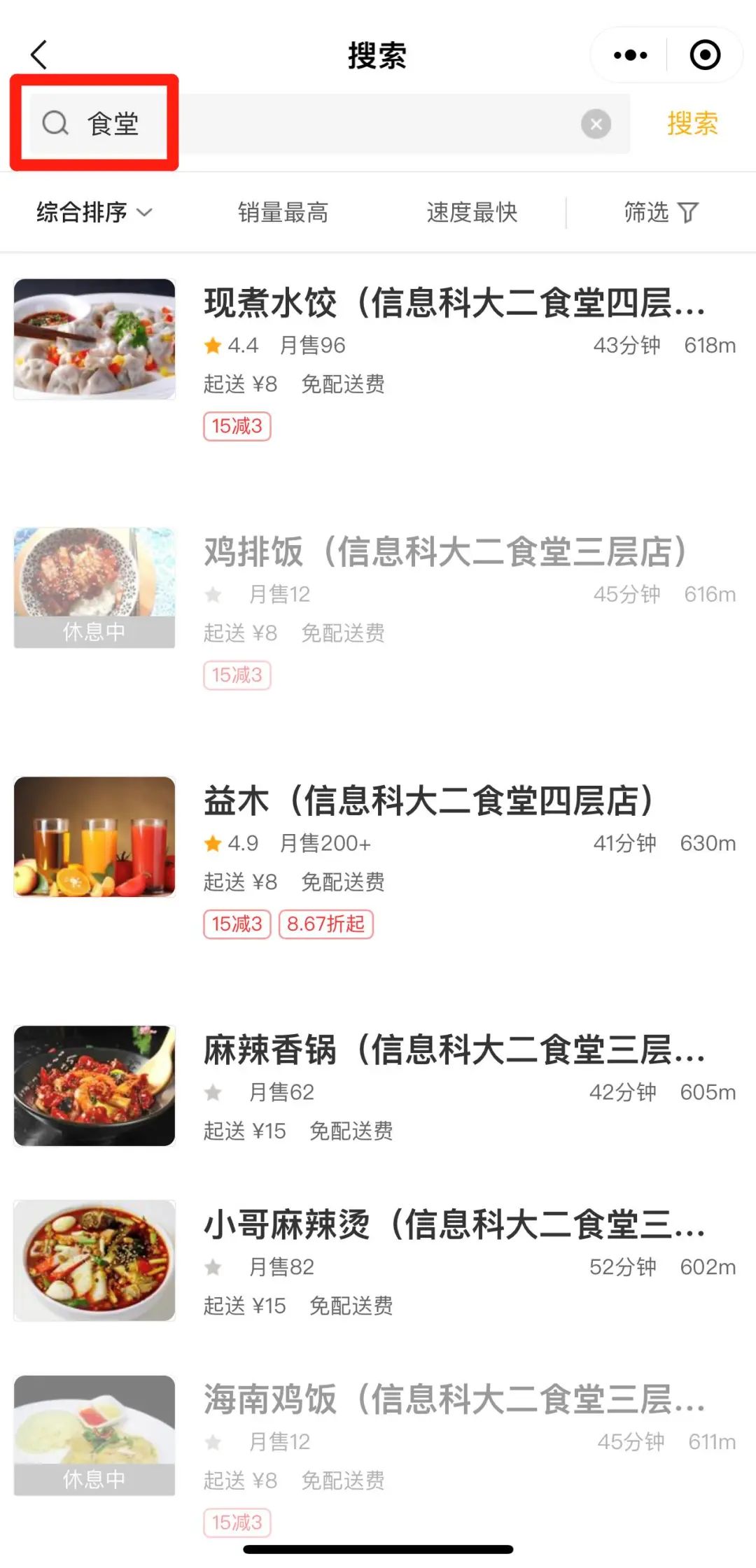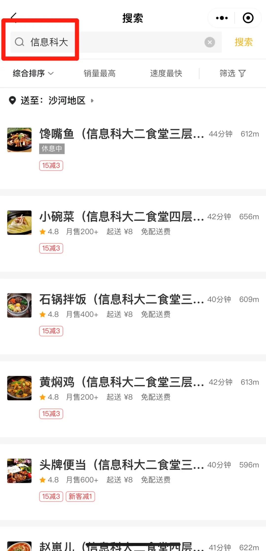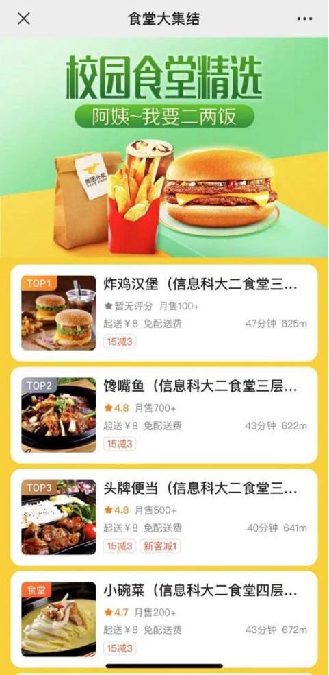 2.通过美团外卖APP和美团小程序搜索 “信息科大”或“食堂”选择食堂店铺即可搜索下单。