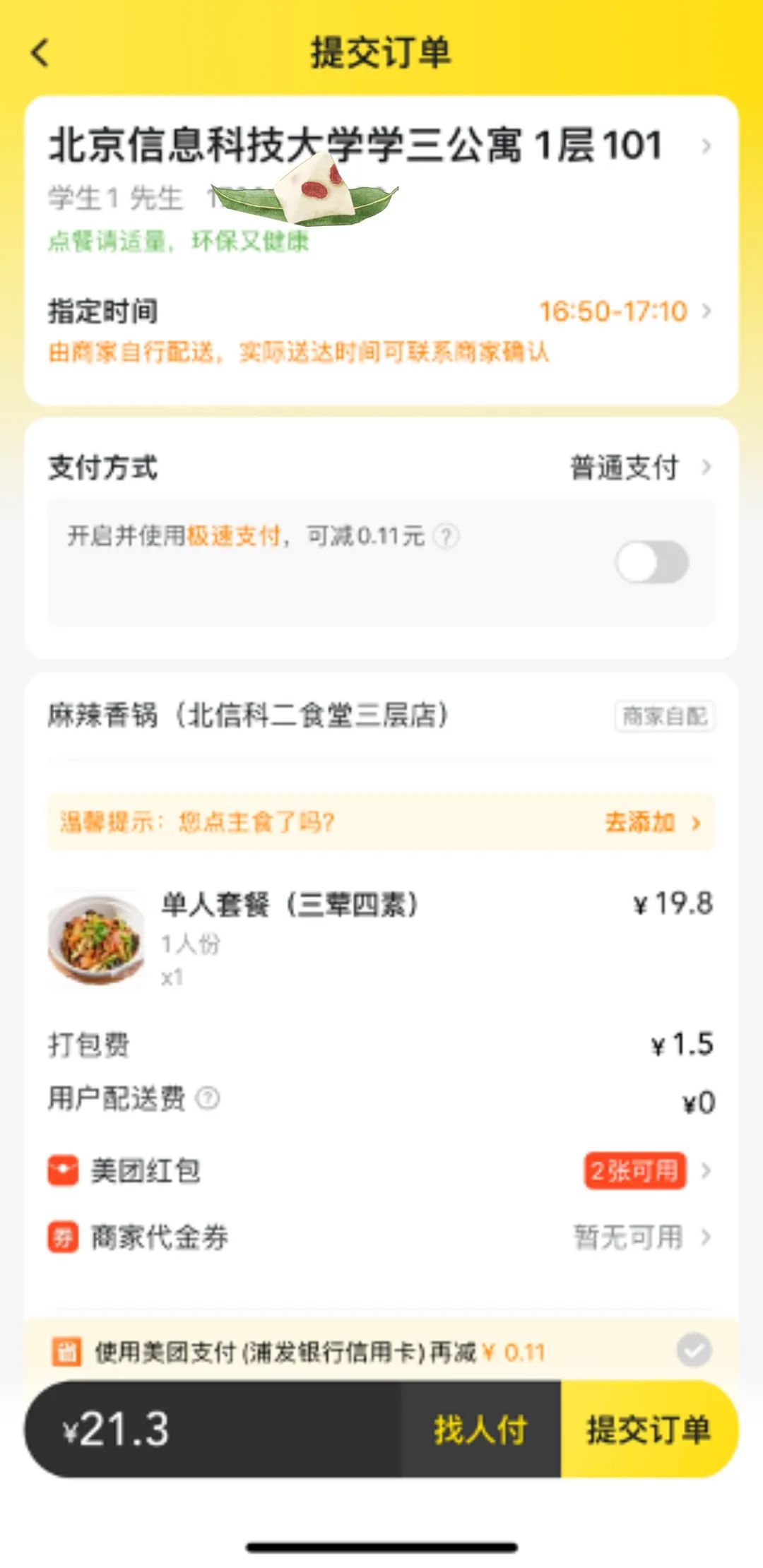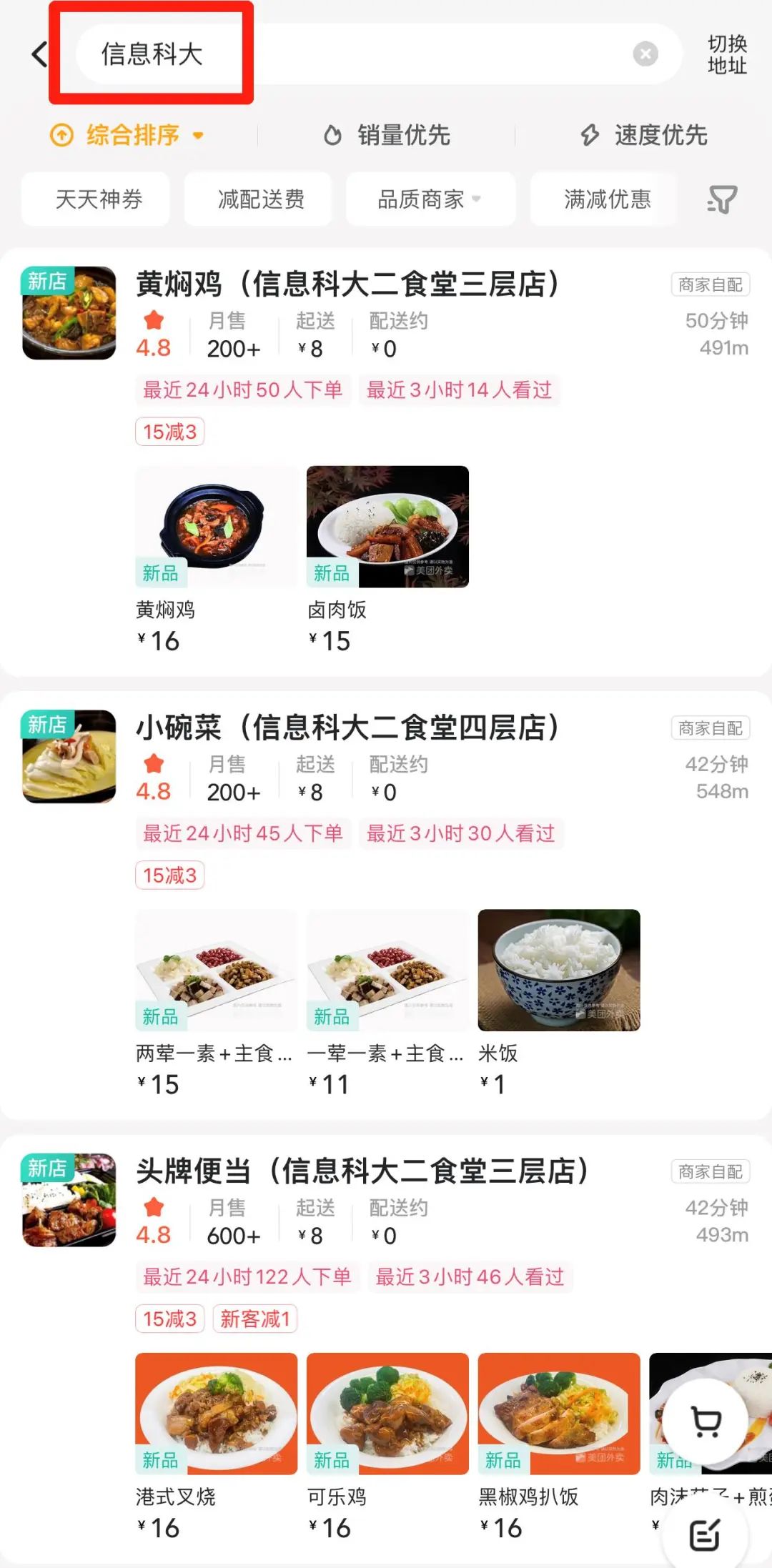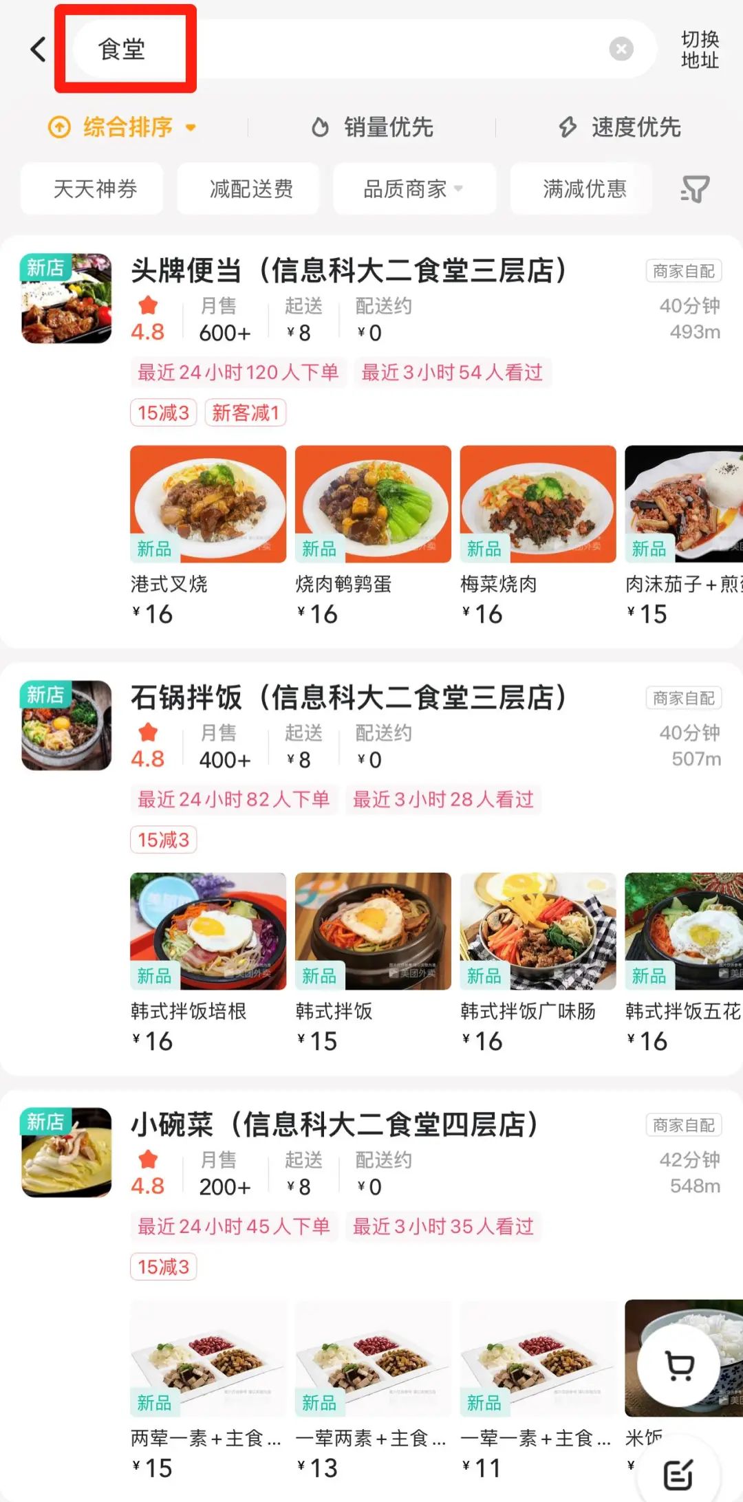 2.通过美团外卖APP和美团小程序搜索 “信息科大”或“食堂”选择食堂店铺即可搜索下单。